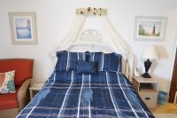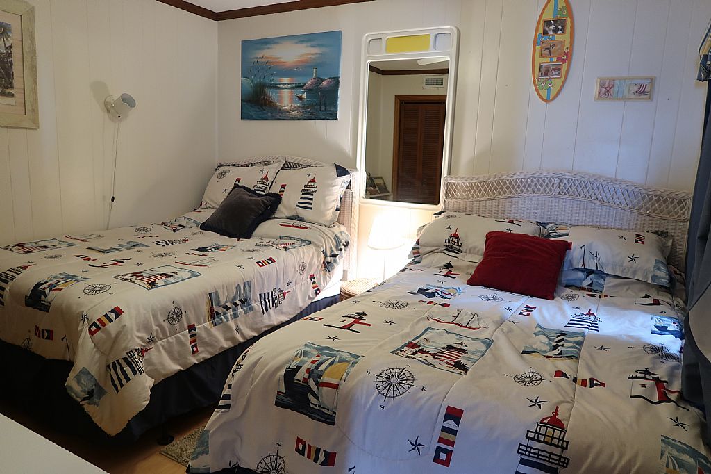 The master bedroom has one Queen bed and a private half bathroom. The second bedroom has two Double beds. There is a full bathroom off of the hallway.
